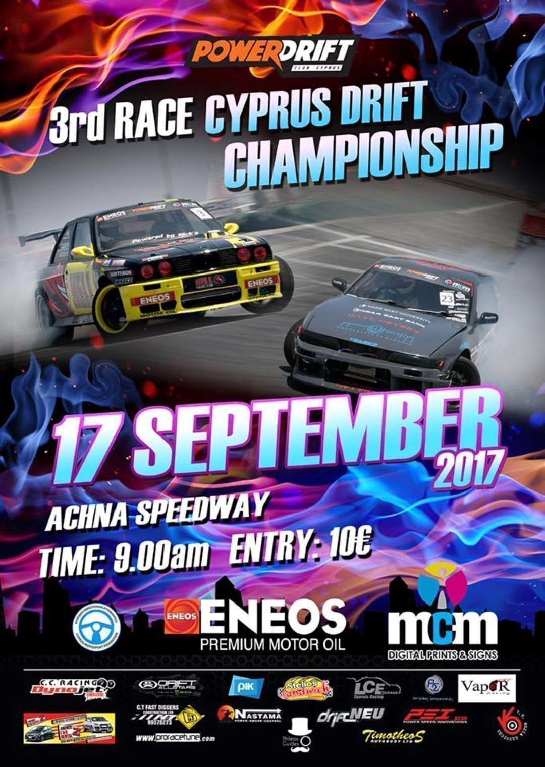 Με τον τρίτο αγώνα drift συνεχίζει το Παγκύπριο Πρωτάθλημα Drift αυτή την Κυριακή 17 Σεπτεμβρίου στην πίστα Achna Speedway. Οι οδηγοί είναι έτοιμοι για ακόμη ένα δύσκολο αγώνα στον οποίο ευχόμαστε πολλές ανατροπές και action για να το απολαύσουν όσο περισσότερο γίνετε οι θεατές που θα παρευρεθούν.