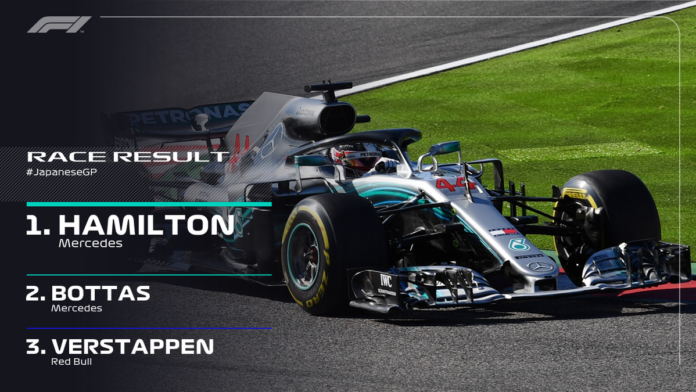 Ο 5ος παγκόσμιος τίτλος του πρωταθλητή βρίσκεται στην αγκαλιά του Χάμιλτον, ο οποίος έκανε… πλάκα στην πίστα της Σουζούκα. Ο Βάλτερι Μπότας με τον Μαξ Φερστάπεν συμπλήρωσαν τις άλλες δύο θέσεις του βάθρου, με τον οδηγό της Red Bull να ανεβαίνει και πάλι στο βάθρο, παρά την ποινή που δέχτηκε για την… αψιμαχία του με τον Ράικονεν.