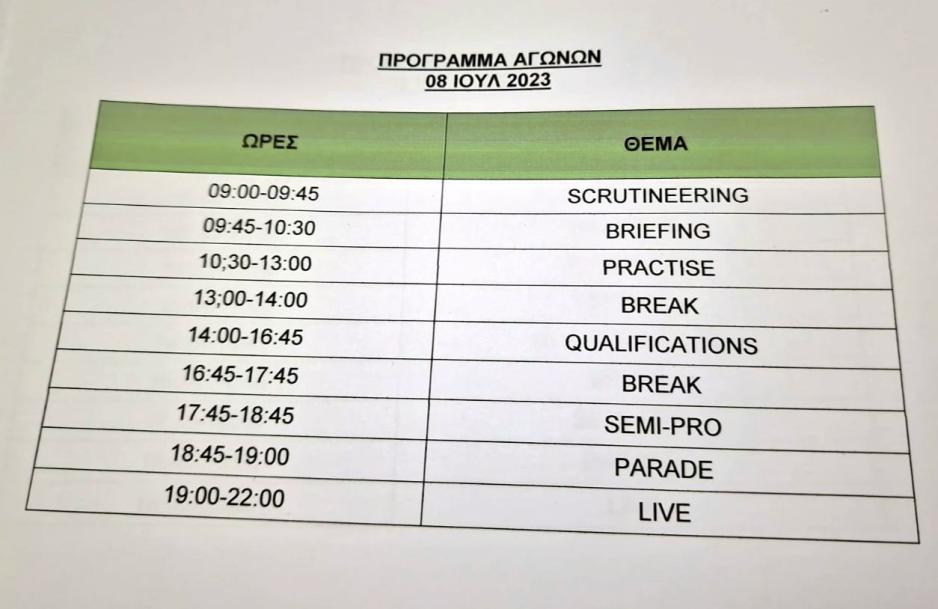 Το πρόγραμμα του αγώνα ξεκινάει στις 9:45 με ενημέρωση των διαγωνιζομένων από τους κριτές. Στις 10:30 θα γίνουν ελεύθερα δοκιμαστικά περάσματα από όλους τους διαγωνιζομένους και μετά από διακοπή μίας ώρας θα πραγματοποιηθούν τα μονά βαθμολογημένα στις 2 το μεσημέρι. Ο αγώνας θα ολοκληρωθεί με τις διπλές μονομαχίες οι οποίες θα διεξαχθούν υπό το φως των προβολέων και θα καθορίσουν το νικητή στις δυο κατηγορίες. Οι τελευταίες θα μεταδοθούν στις 19:00 απευθείας από το κανάλι Cytavision Sports 2HD και από την εφαρμογή CYTAVISIONGO.