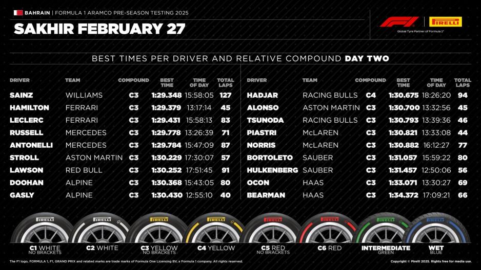 Ο Carlos Sainz ήταν ο ταχύτερος πιλότος χτές, δεύτερη ημέρα δοκιμών στη πίστα του Μπαχρέιν, καθώς ο Ισπανός πέτυχε τον ταχύτερο χρόνο της ημέρας, χρόνος που ήταν οριακά ταχύτερος από αυτόν που σημείωσε o Lewis Hamilton.