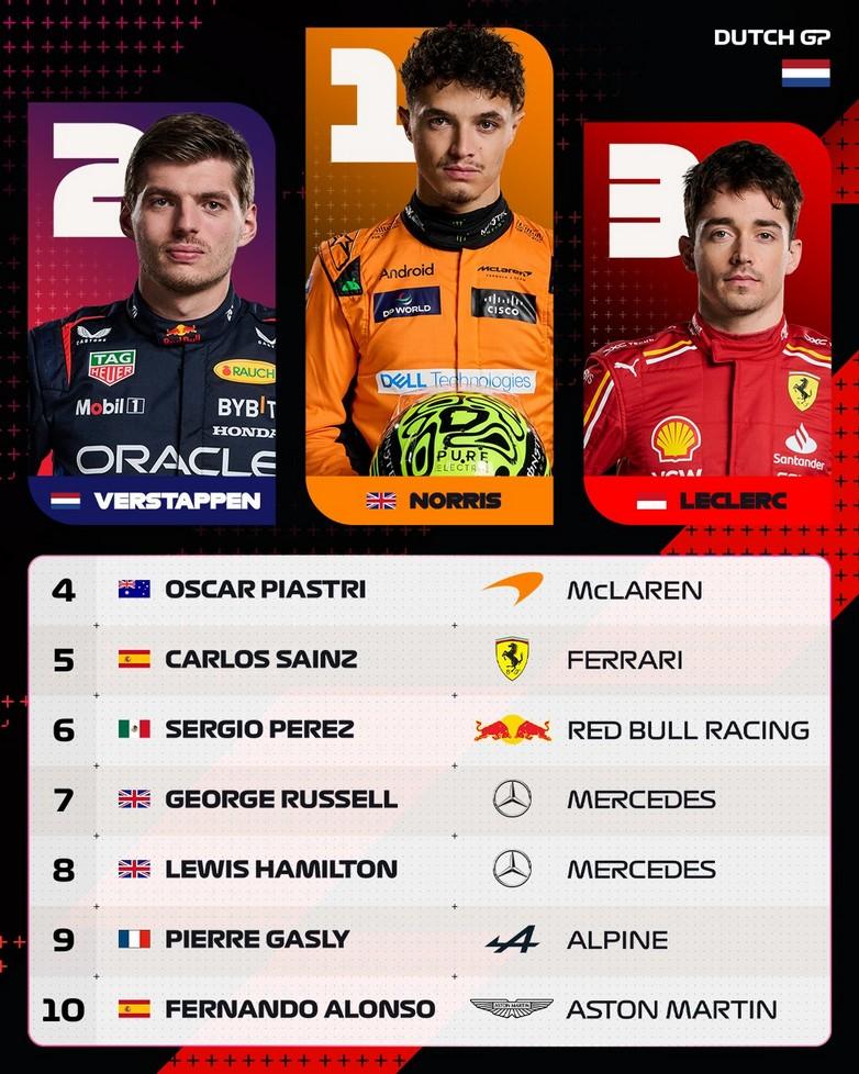 O Lando Norris δεν άφησε δικαιώματα αμφισβήτησης και πήρε μία ακόμη Pole Position (την 4η της καριέρας του) δείχνοντας πως είναι ο μεγάλος αντίπαλος πλέον του Verstappen, ακόμα και μέσα στην πατρίδα του.  Ο Ολλανδός με τη σειρά του ξεκινά από την 2η θέση έχοντας πίσω του τη δεύτερη McLaren του Oscar Piastri.  Στην 4η θέση ο Russell και στην πέμπτη ο Perez.
