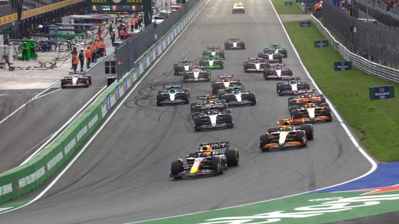 Τα πέντε φώτα έσβησαν και τα μονοθέσια ξεκίνησαν. Ο Norris δεν θα κάνει καλή εκκίνηση και ο Verstappen θα καταφέρει ήδη από την 1η στροφή να πάρει την πρωτιά. Μάλιστα και ο τρίτος Oscar Piastri θα χάσει τη θέση του από τον τέταρτο Russell.  Καταστροφική εκκίνηση για τις δύο McLaren που φαίνεται υπό πίεση να «κομπλάρουν»,  με τον Verstappen να προσφέρει στους θεατές αυτό που πραγματικά περίμεναν. Ένα προσπέρασμα ήδη από την πρώτη στροφή.