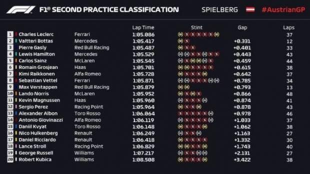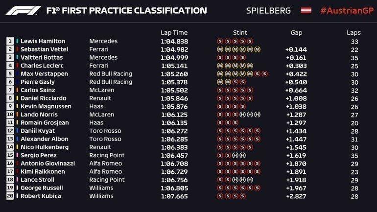 Στο πρώτο δοκιμαστικό O Lewis Hamilton σημείωσε τον ταχύτερο γύρο με 1:04.838, με τον Sebastian Vettel να τον ακολουθεί με διαφορά μόλις 0.144 δεκάτων. Ανατροπή όμως είχαμε στη δεύτερη περίοδο στην Αυστρία με τον Leclerc να κάνει τον καλύτερο χρόνο και τους Bottas και Verstappen να έχουν από μια πολύ άσχημη έξοδο.