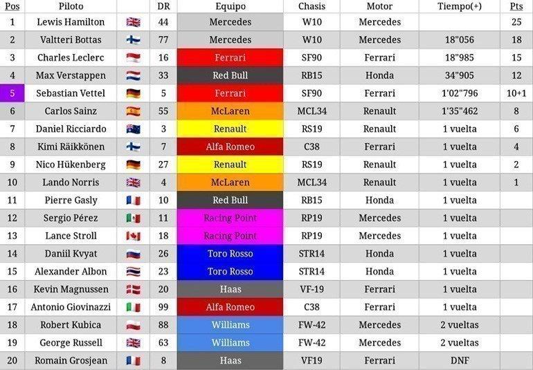 Ο Βρετανός πανηγύρισε με χαρακτηριστική άνεση την έκτη νίκη του στη φετινή σεζόν και έκανε ακόμη ένα βήμα για την κατάκτηση και του φετινού τίτλου, ενώ η γερμανική ομάδα έκανε το «8 στα 8» και το έκτο «1-2» της χρονιάς, καθώς ο Φινλανδός Βάλτερι Μπότας τερμάτισε δεύτερος, αν και πιέστηκε στο φινάλε από τη Ferrari του Μονεγάσκου Σαρλ Λεκλέρκ.