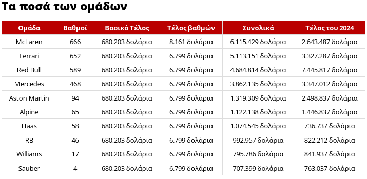Αυτό σημαίνει ότι η McLaren θα πληρώσει συνολικά 6.115.429 δολάρια, με τη Ferrari να ακολουθεί με 5.113.151 δολάρια και η τρίτη Red Bull να καταβάλει ένα ποσό 4.684.814 δολαρίων.