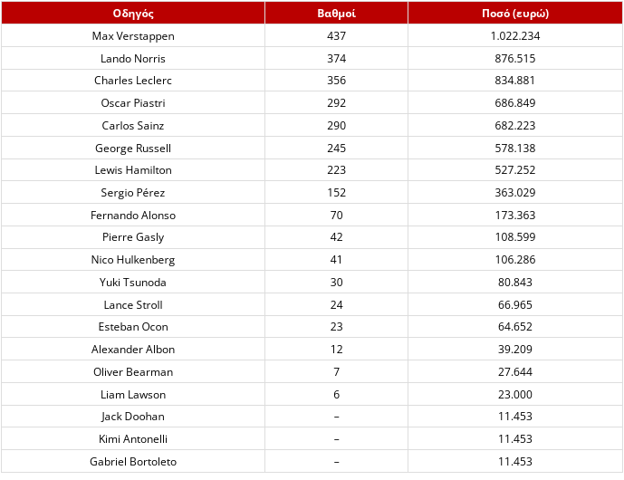 Σε ότι αφορά τους πιλότους. Αυτοί πληρώνουν ένα βασικό τέλος 11.453 ευρώ για την Super License τους και επιπλέον 2.313 ευρώ ανά βαθμό που συγκέντρωσαν τη προηγούμενη σεζόν. Αυτό σημαίνει πως ο Max Verstappen θα πληρώσει 1.022.234 ευρώ, με τον Lando Norris να ακολουθεί με 876.515 ευρώ.