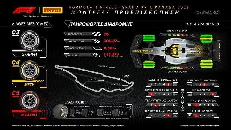 Για φέτος τα ελαστικά που έχουν επιλεγεί για το Καναδικό Grand Prix είναι η γόμα C3 ως P Zero λευκή σκληρή, η γόμα C4 ως P Zero κίτρινη μέση και η γόμα C5 ως P Zero κόκκινη μαλακή.