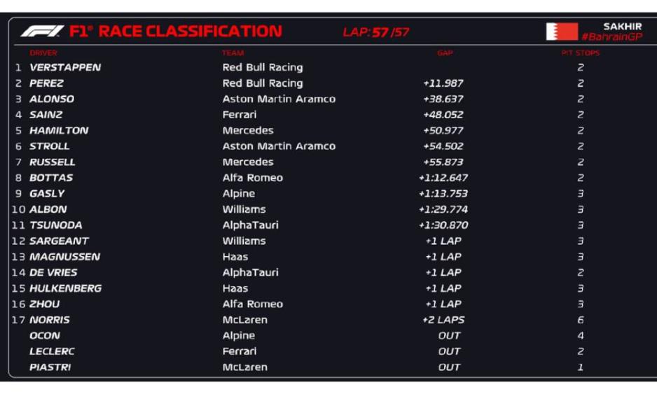 Το πρώτο από τα συνολικά 23 Grand Prix της φετινής χρονιάς ολοκληρώθηκε στο Μπαχρέιν με τον περσινό πρωταθλητή Max Verstappen να τερματίζει όπως ξεκίνησε, πρώτος. Η Red Bull θα κάνει το 1-2 όμως τη μεγαλύτερη είδηση αποτελεί η μηχανική εγκατάλειψη του Leclerc και η τρίτη θέση του Alonso της Aston Martin.