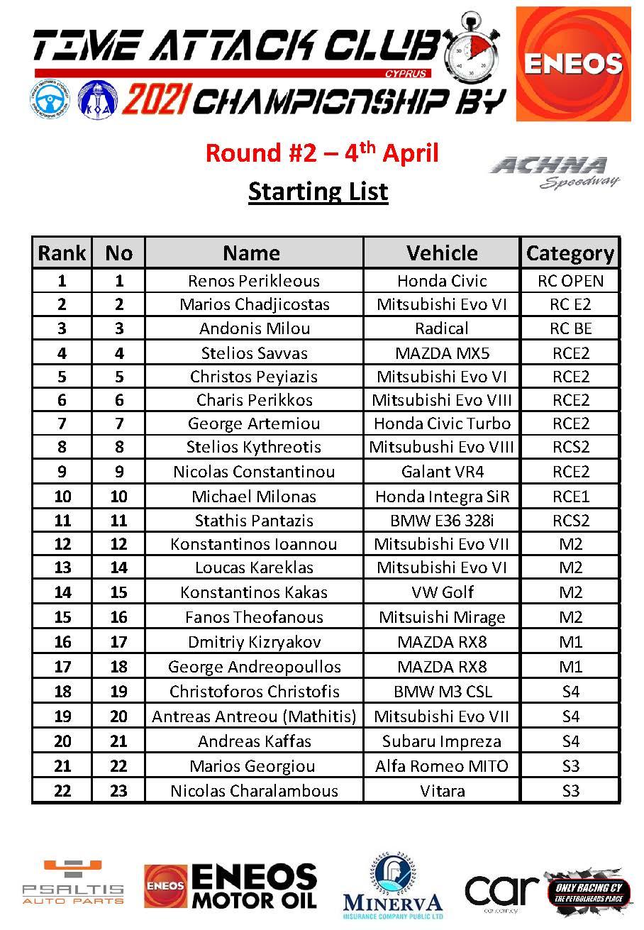 Έτοιμες λοιπόν και οι συμμετοχές για τον 2ο αγώνα του Παγκυπρίου Πρωταθλήματος Time Attack by ENEOS. 22 συνολικά συμμετοχές θα είναι μαζί μας την Κυριακή 4 Απριλίου στην Achna Speedway.