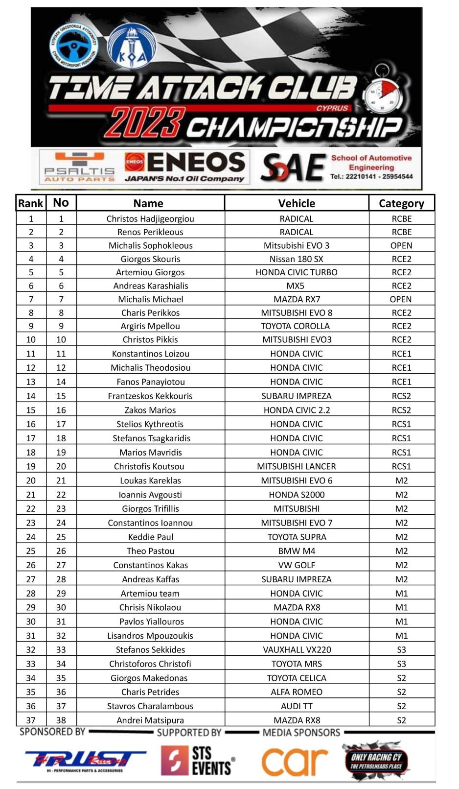 Χορηγοί του αγώνα και του Παγκύπριου Πρωταθλήματος Time Attack είναι η εταιρεία Psaltis Autoparts με τα λιπαντικά ENEOS και το School of Automotive Engineering.