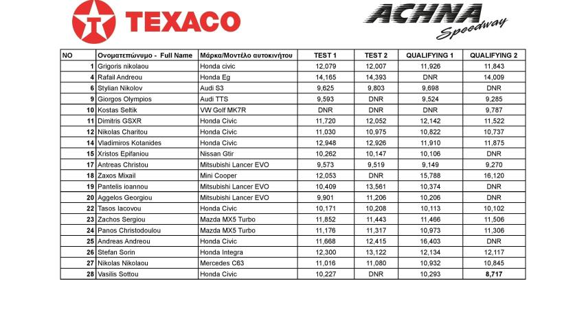 Η διαδικασία της χρονομέτρησης έγινε με δύο δοκιμαστικά περάσματα και δύο χρονομετρημένα. Αφου καταγράφηκαν οι χρόνοι οι οδηγοί μπήκαν σε κατηγορίες "index" όπου έτρεξαν με άλλους οδηγούς οι οποίοι είχαν όμοιους χρόνους. Καλύτερος χρόνος της ημέρας ήταν εκείνος του Βασίλη Σώττου με 8,717 δευτερόλεπτα.