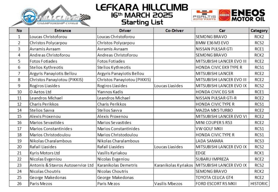 Με δυνατές συμμετοχές ξεκινάει το Παγκύπριο Πρωτάθλημα Αναβάσεων της Κυπριακής Ομοσπονδίας Αυτοκινήτου, με τον αγώνα των Λευκάρων την Κυριακή 16 Μαρτίου.