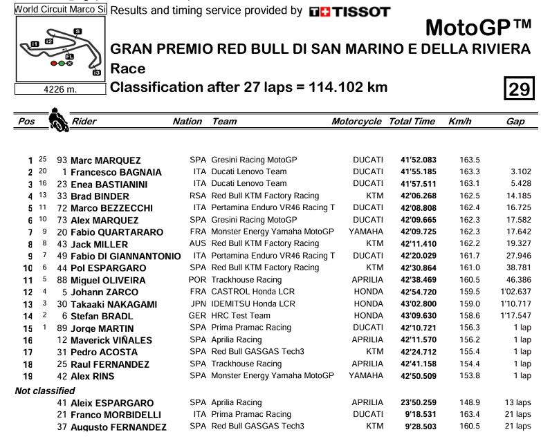 Ο Brad Binder τερμάτισε τέταρτος, μπροστά από τον Marco Bezzecchi και τον Alex Marquez. Έβδομος ήταν ο Jack Miller, με τους Fabio Quartararo, Fabio Di Giannantonio και Pol Espargaro να συμπληρώνουν την πρώτη δεκάδα.
