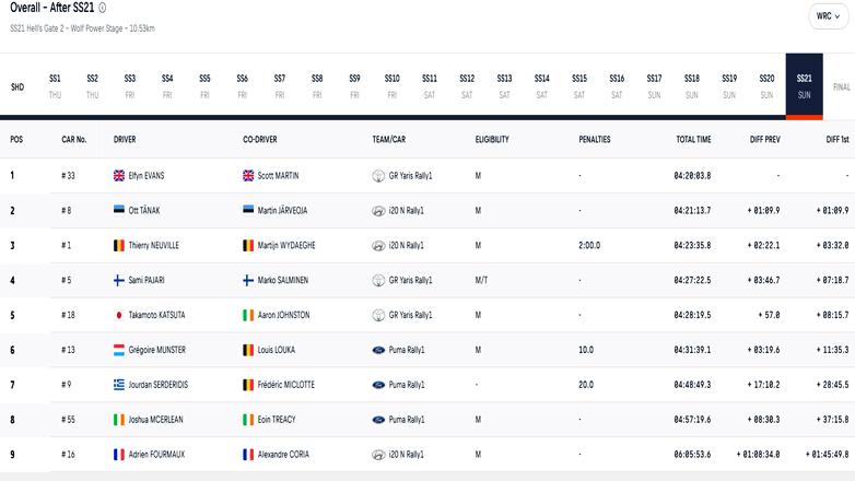 Μετά από 1397.91 χιλιόμετρα από τα οποία τα 1014.81 έγιναν σε απλές διαδρομές και τα 383.10 σε 21 Ειδικές Διαδρομές, οι Elfyn Evans-Scott Martin με TOYOTA GR YARIS Rally 1 κέρδισαν έναν πολύ δύσκολο αγώνα. Δυστυχώς οι δύο φορές παγκόσμιοι πρωταθλητές Kalle Rovanpera – Jonne Halttunen εγκατέλειψαν σήμερα από μηχανικά προβλήματα. Η λάσπη ήταν ο μεγάλος αντίπαλος σήμερα.
