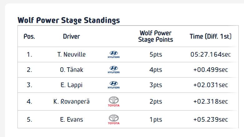 Οι οδηγοί της Hyundai, Neuville – Tanak – Lappi, που όλοι τους αντιμετώπισαν αρκετές προκλήσεις και προβλήματα στο φετινό Ράλλυ της Αφρικής, τα έδωσαν όλα στην Wolf Power Stage και πήραν αντίστοιχα τις θέσεις 1 – 2 – 3 . Παίρνοντας σημαντικούς βαθμούς αλλά και ψυχολογία μετά από ένα πολύ δύσκολοι ράλλυ που “έκρυβε” πολλές εκπλήξεις.