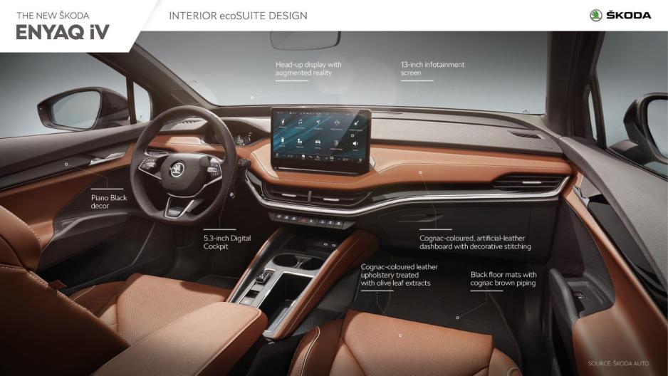 Πιο συγκεκριμένα, η βασική έκδοση Enyaq 50 iV προσφέρει ισχύ στα 109 kW και 220 Nm με τον ηλεκτροκινητήρα να είναι τοποθετημένος στον πίσω άξονα και την αυτονομία να αγγίζει τα 359 χιλιόμετρα. Η δεύτερη έκδοση αφορά το Enyaq 60 iV με την ισχύ να ανεβαίνει στα 132 kW και τη ροπή στα 310 Nm. Και αυτή η έκδοση προσφέρει ένα ηλεκτροκινητήρα στον πίσω άξονα και αυτονομία μέχρι 412 χιλιόμετρα. Στην ίδια διάταξη και ο κινητήρας του Enyaq 80 iV που αποδίδει 150 kW και 310 Nm ροπής και την αυτονομία να φτάνει τα 534 χιλιόμετρα. Στη γκάμα υπάρχουν ακόμα δύο εκδόσεις που διαθέτουν κινητήρα σε κάθε άξονα, κάνοντας το τσεχικό μοντέλο τετρακίνητο. Ο λόγος για το Enyaq 80x iV, με τη συνδυαστική ισχύ των δύο ηλεκτροκινητήρων είναι φθάνει τα 195 kW και τα 425 Nm ροπής, και το Enyaq vRS iV με απόδοση 225 kW και 460 Nm ροπής. Η αυτονομία των δύο τελευταίων εκδόσεων φθάνει τα 496 χιλιόμετρα. Το εσωτερικό είναι κατασκευασμένο από φυσικά, βιώσιμα επεξεργασμένα και ανακυκλωμένα υλικά και προσφέρεται στον αγοραστή με μια σειρά δέκα διαφορετικών επιλογών για πλήρη εξατομίκευση. Το Enyaq iV έχει την ικανότητα να γεμίζει την μπαταρία του σε φορτιστή που φτάνει ακόμα και τα 125 kW σε μόλις 38 λεπτά για το 80%, ακόμα και αν πρόκειται για τη μεγαλύτερη μπαταρία των 82 kWh. Η Skoda προσφέρει τρεις εκδόσεις του wallbox SKODA iV για φόρτιση στο σπίτι όπου απαιτούνται 6 έως 8 ώρες, ανάλογα με το μέγεθος της μπαταρίας.