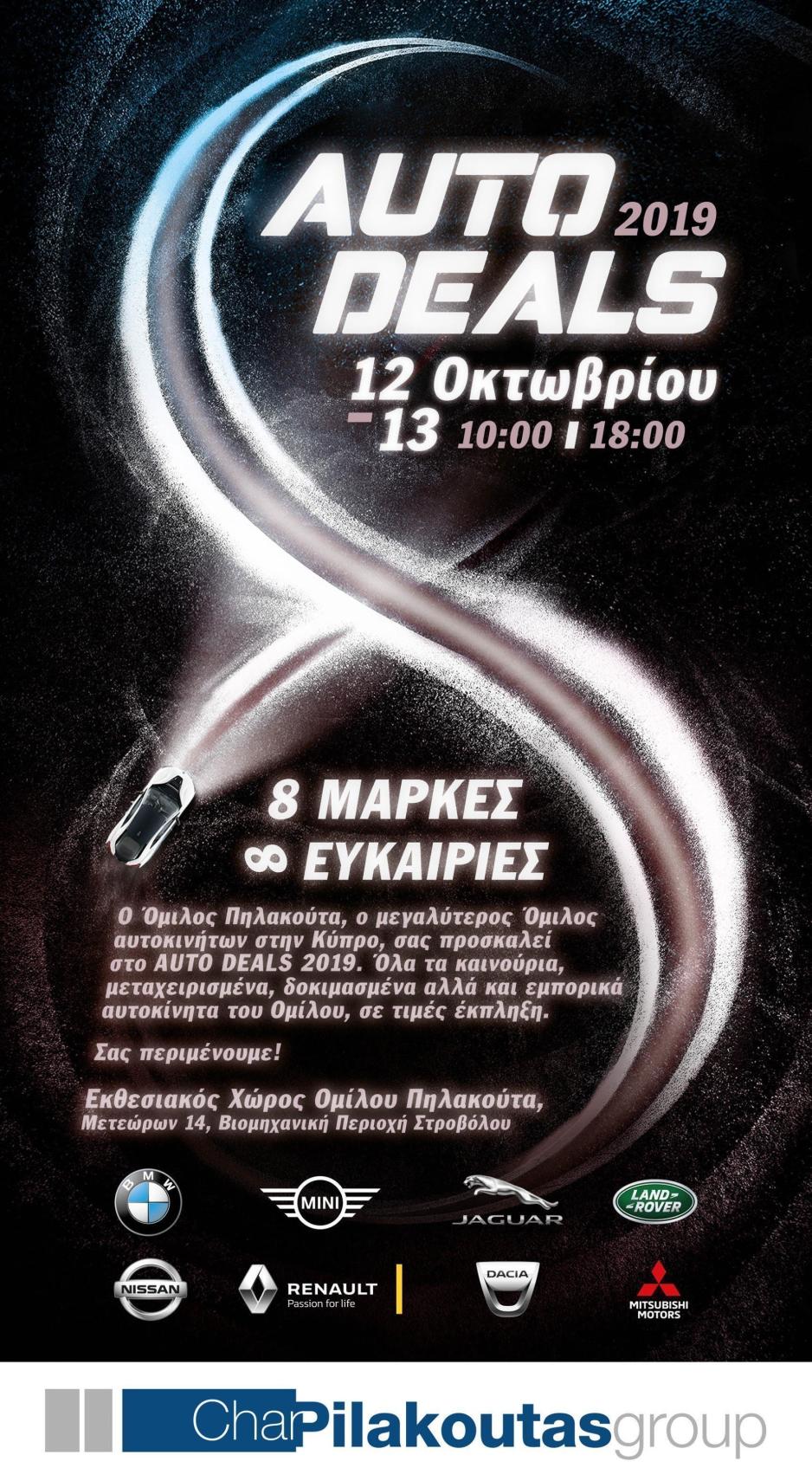 Με αυτό το σύνθημα, ο Όμιλος Πηλακούτα διοργανώνει το καθιερωμένο πλέον Auto Deals για το 2019. Το Σάββατο 12 και την Κυριακή 13 Οκτωβρίου, από τις 10:00 μέχρι τις 18:00, οι επισκέπτες θα έχουν την ευκαιρία να δουν από κοντά αλλά και να οδηγήσουν όλα τα μοντέλα του Ομίλου.