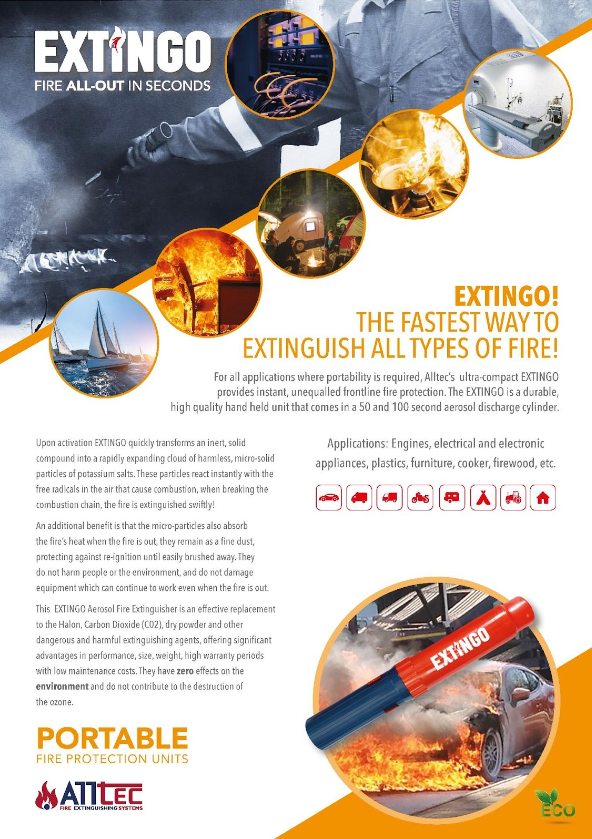 Πολύ εύχρηστος και ελαφρύς, κάτω από 0.5Kg, ο φορητός πυροσβεστήρας Extingo κυκλοφορεί σε 2 μοντέλα, των 50 και των 100 δευτερολέπτων, χρόνος πολύ μεγαλύτερος από αντίστοιχης κατηγορίας συμβατικούς πυροσβεστήρες. Χωράει εύκολα στο ντουλαπάκι του αυτοκινήτου και δεν ενέχει κίνδυνο από τις θερμοκρασίες που αναπτύσσονται εντός του κατά τους θερινούς μήνες.