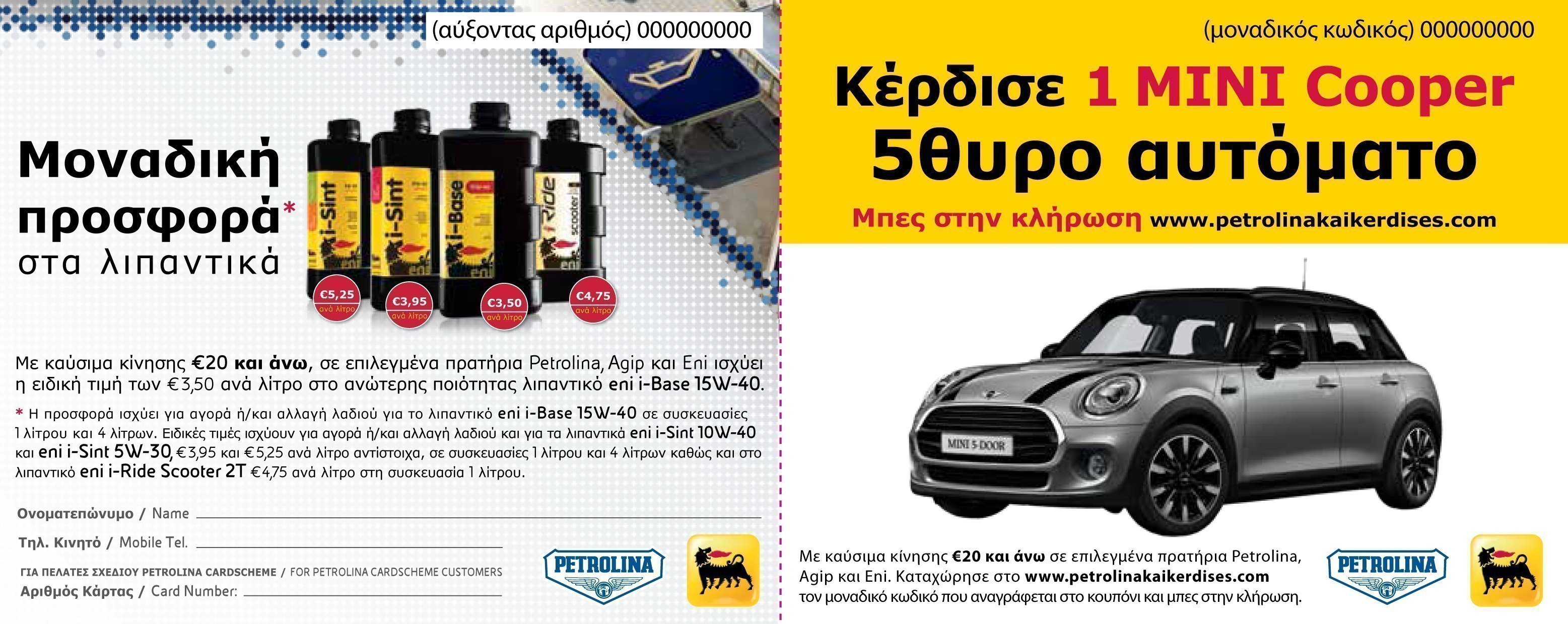 Πετρολίνα: Ειδικές προσφορές σε λιπαντικά Eni και συμμετοχή σε κλήρωση για ένα Mini Cooper