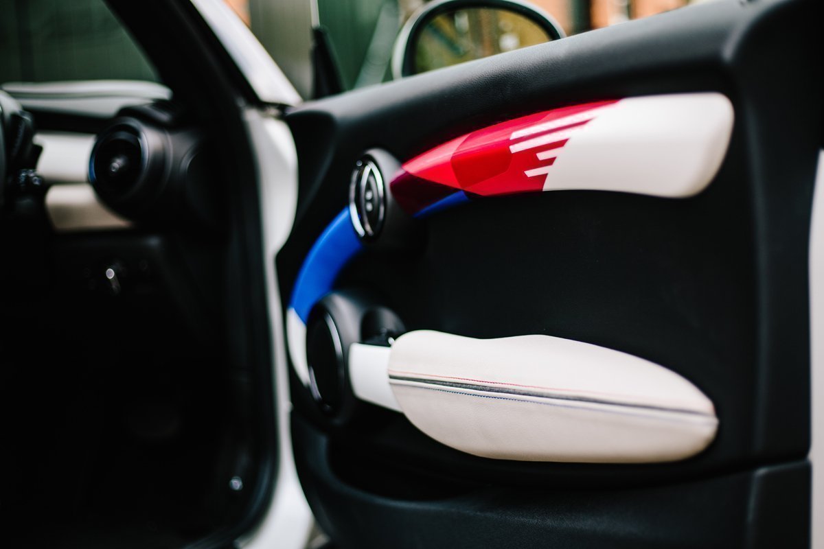 Το δερμάτινο σαλόνι του εσωτερικού σε Satellite Grey αποτελεί το ιδανικό φόντο για να αναδειχτούν τα αποκλειστικά στοιχεία του MINI. Το blue-black διάφανο βερνίκι  των χρωμιωμένων εξωτερικών στοιχείων επαναλαμβάνεται και σε ορισμένα χρωμιωμένα στοιχεία του εσωτερικού. Τα μικρά ονόματα του γαμπρού και της νύφης, όπως και η ημερομηνία του γάμου και ευχές προς τους νεόνυμφους έχουν προστεθεί στη μεγάλη διακοσμητική λωρίδα μπροστά από το κάθισμα του συνοδηγού. Ένα ακόμα ξεχωριστό στοιχείο της καμπίνας είναι εμπνευσμένο από το γραφικό οροφής, το οποίο ενσωματώνεται στις διακοσμητικές λωρίδες των θυρών, πίσω από το τιμόνι και στα προσκέφαλα. Σε αυτά  μάλιστα βλέπουμε μία αφηρημένη εκδοχή της σημαίας Union Jack στη μία πλευρά και την αποτύπωση της Αμερικανικής σημαίας (Stars & Stripes) με διάτρητες επιφάνειες και ραφές στην άλλη πλευρά.
