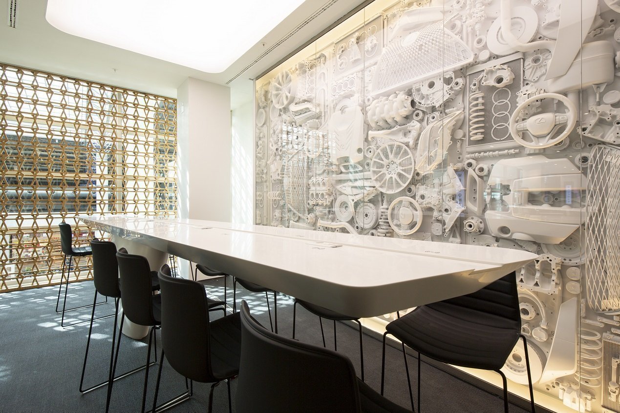 Τα έπιπλα έχουν επιλεγεί ή έχουν σχεδιαστεί ειδικά για το lounge, συμπεριλαμβανομένων τραπεζιών πολλαπλών λειτουργιών και bar counters που είναι προσαρμοσμένα στην αρχή σχεδιασμού L-finesse η οποία εφαρμόζεται στα αυτοκίνητα της Lexus. Ο φωτισμός προσαρμόζεται για να ταιριάζει σε διαφορετικά περιβάλλοντα μέσα στο σαλόνι και περιλαμβάνει δύο εντυπωσιακές εγκαταστάσεις -ένα σύμπλεγμα από σφαίρες Iris πάνω από το μπαρ και τα Inaho φώτα που κυριαρχούν καθώς πλησιάζουν οι άνθρωποι- και τα δύο προέκυψαν ως αποτέλεσμα των συμμετοχών στον ετήσιο διαγωνισμό Lexus Design Award. Διατίθενται επίσης ορισμένα πρωτότυπα έργα άλλων εξελίξιμων  σχεδιαστών που έχουν συμμετάσχει στον διαγωνισμό Lexus Design Award.