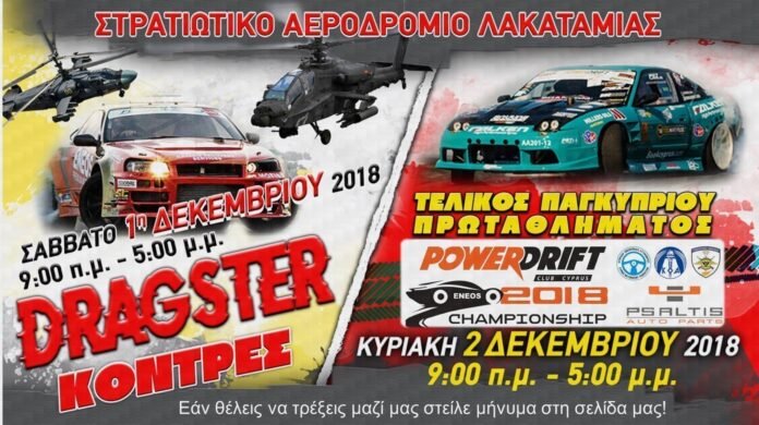 Ο αγώνας αυτός, τον οποίο διοργανώνει το Power Drift Club υπό την αιγίδα της Κυπριακής Ομοσπονδίας Αυτοκινήτου, θα πραγματοποιηθεί την ερχόμενη Κυριακή από τις 9:00πμ πρωί μέχρι τις 4μμ το απόγευμα και είναι υπό την αιγίδα του Υπουργείου Άμυνας και της Εθνικής Φρουράς.