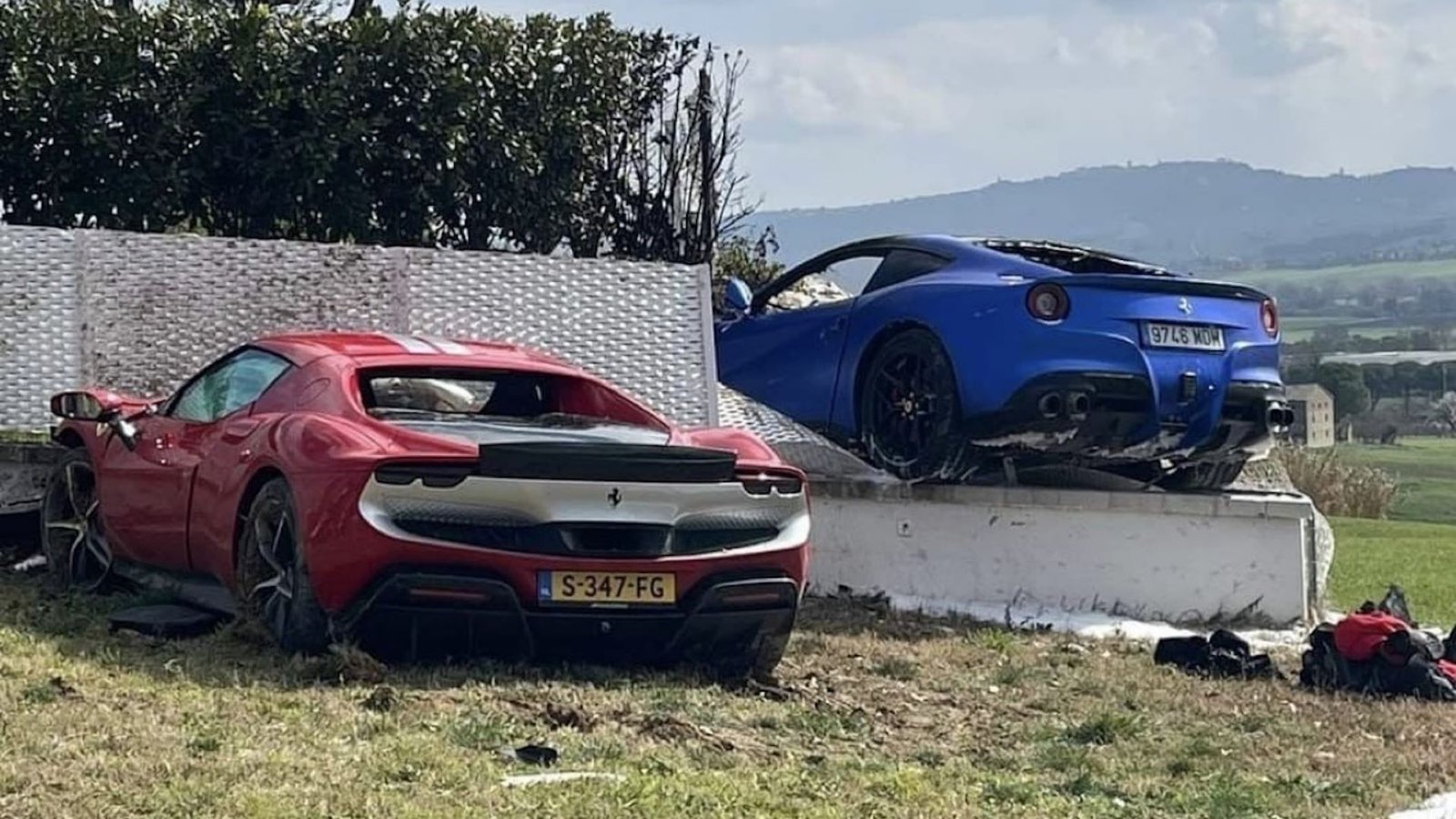 Τα δύο αυτοκίνητα, μια κόκκινη Ferrari 296 GTB και μια μπλε F12berlinetta χτύπησαν στο ανάχωμα που λειτούργησε ως ράμπα, με τα δύο αυτοκίνητα να απογειώνονται και να σταματούν στον φράχτη ενός σπιτιού, με την μπλε Ferrari να παίρνει φωτιά και να καταστρέφεται ολοσχερώς.