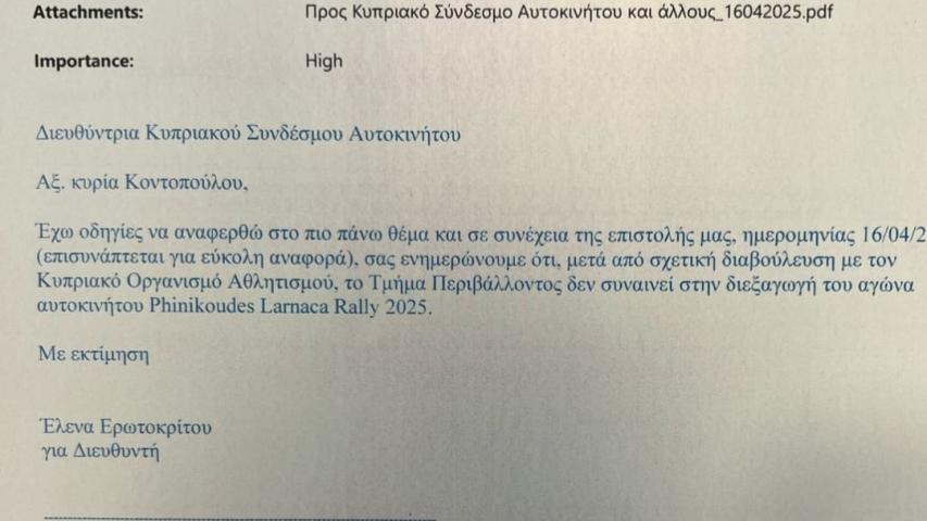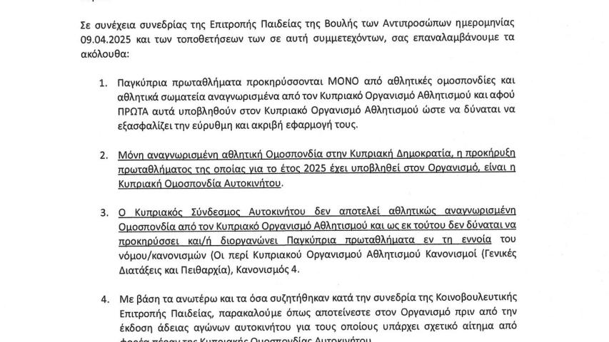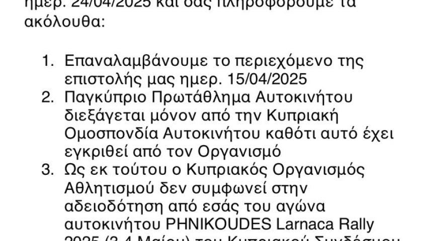 - Δεν δικαιούται να προκηρύσσει Παγκύπρια Πρωταθλήματα, ούτε ράλι, ούτε καρτ, ούτε τίποτα. Ο ΚΟΑ είναι πέρα για πέρα ξεκάθαρος, δείτε τις συνημμένες επιστολές.