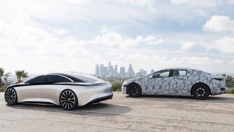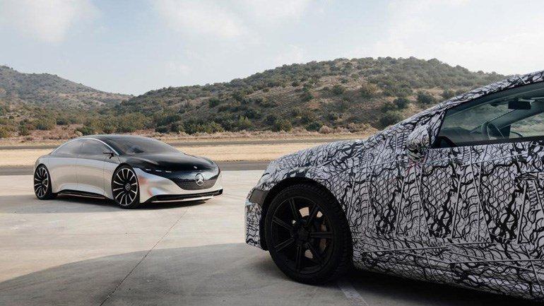 Στις φωτογραφίες, το αμάξωμα της EQS είναι πλήρως καμουφλαρισμένο. Το μοντέλο παραγωγής ποζάρει δίπλα στην πρωτότυπη Vision EQS, δηλαδή στο όχημα που βασίστηκε.