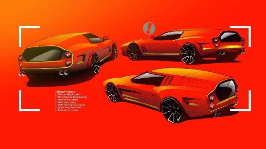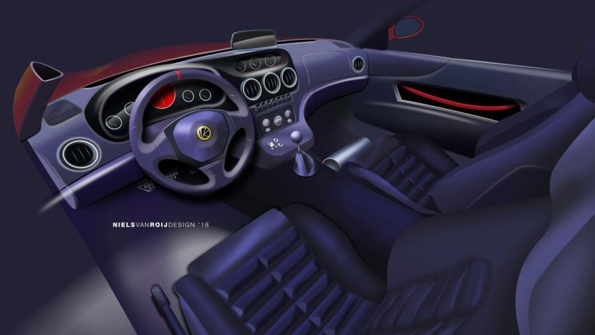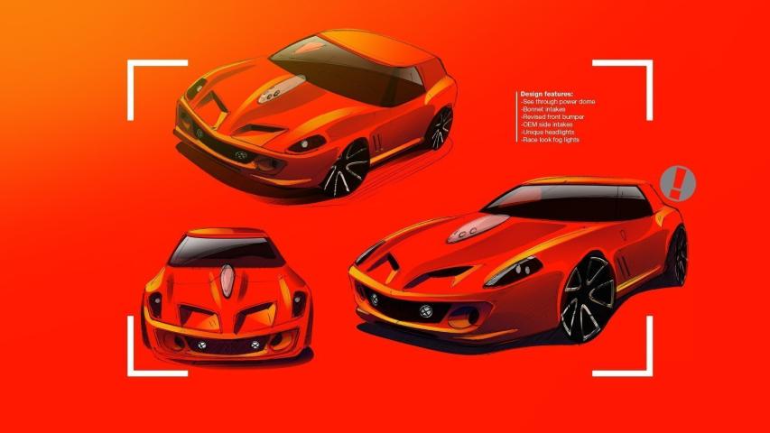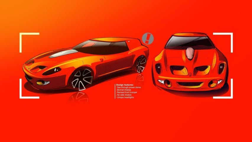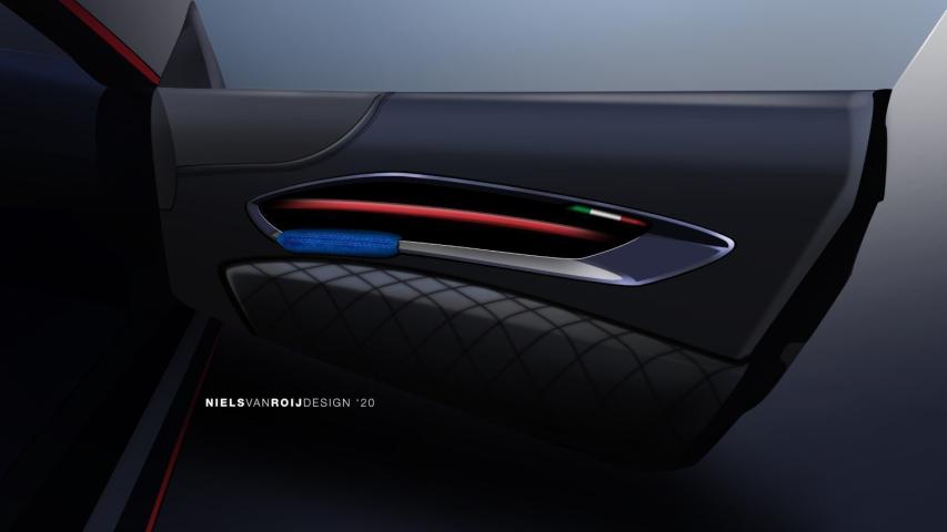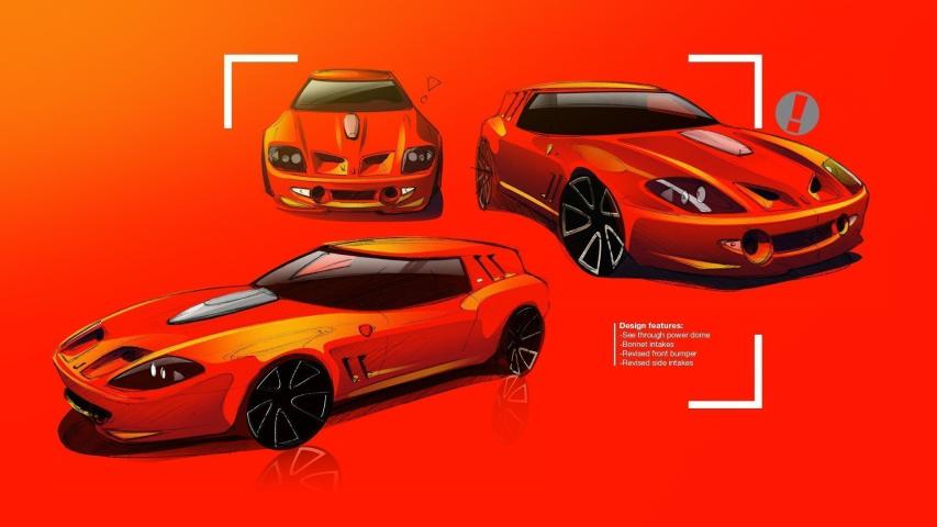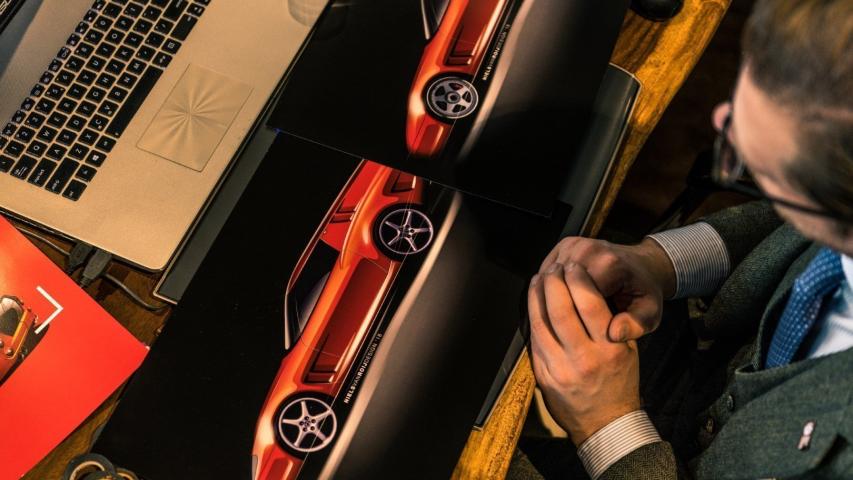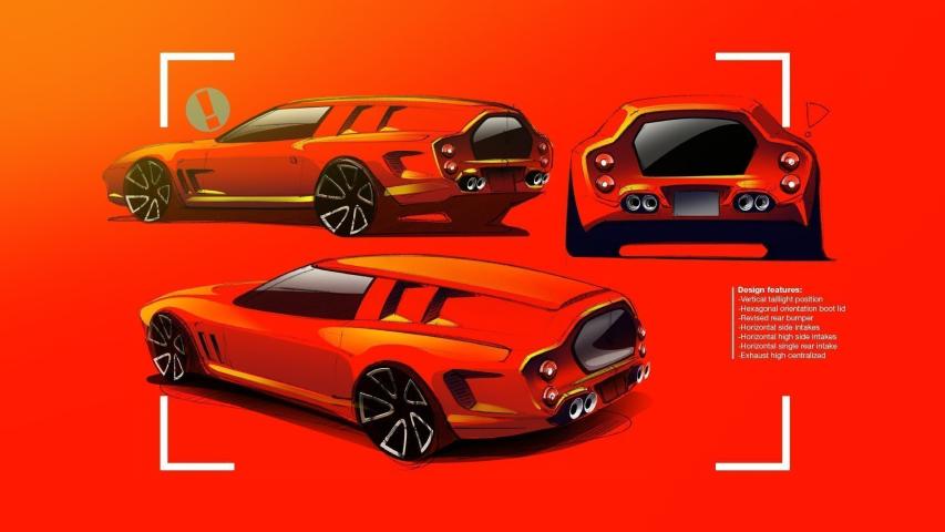 “Automotive design is about the search and the experiment” according to Van Roij “Which is only truly achievable in a handmade sketch. In the ideation sketches differences can not only be seen in proportions and surfacing, the skin of the car, but also in the application of graphics and other details. Such as the bespoke exhausts and unique headlights. Eventually this process produces a so-called key sketch: the one sketch chosen to be developed into more elaborated, rendered ideas.”