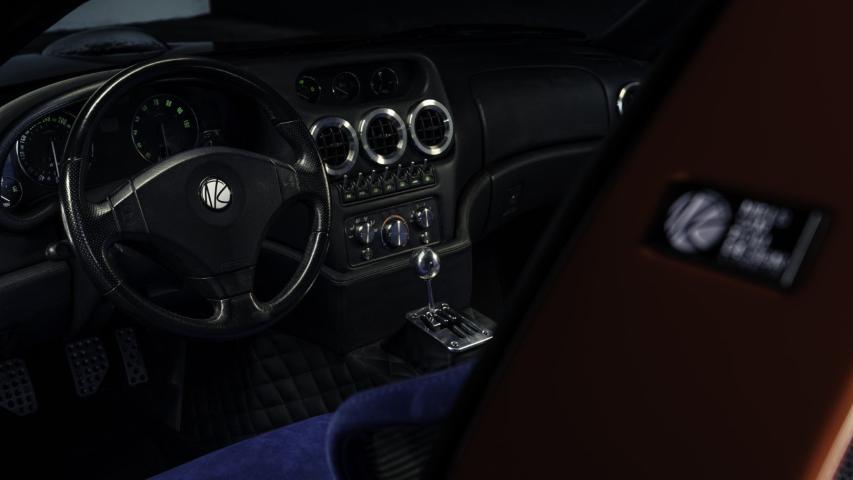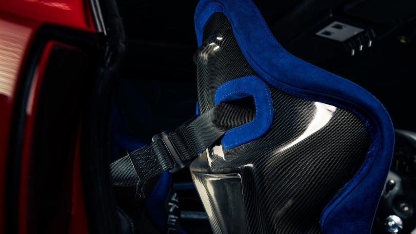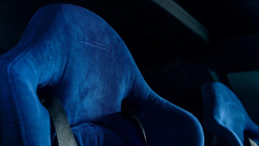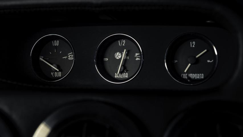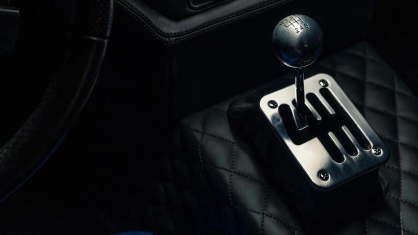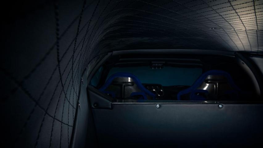 The Breadvan Hommage features a handmade interior. The iconic outline of the exterior design has been embroidered into the blue Alcantara carbon fibre backed seats. The monogram can also be found on the dials, all 7 boasting pure silver inlays. The clock says: ‘che importa’. Italian for ‘who cares!’ All switchgear is made out of milled aluminium, linking to the gated shifter, which is set on a raised block. The driver is surrounded by quilted black leather: it can be found on the centre console, the lower door cards and the headliner. The door panels feature an unpainted, hand beaten aluminium element, which links to the custom body, made in the exact same way. A small embroidered Italian flag in the corner of the aluminium insert is highlighting the roots of the vehicle. The door is opened through pulling a lightweight red cord, whilst a blue Alcantara insert functions as a grab handle to close it.