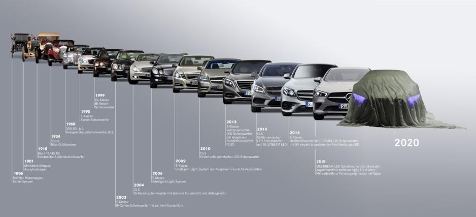 Το 2013, περίπου 100 χρόνια μετά την εισαγωγή του ηλεκτρικού φωτισμού των οχημάτων, η τρέχουσα S-Class (W 222) έγινε το πρώτο όχημα παγκοσμίως που έφερε φωτισμό χωρίς καθόλου λαμπτήρες. Ήταν το πρώτο αυτοκίνητο που διέθετε μόνο LED φώτα στο βασικό του πακέτο. Ένα χρόνο αργότερα, το 2014, η σειρά CLS (σειρά μοντέλων 218) σημάδεψε το ντεμπούτο των προβολέων MULTIBEAM-LED. Τέσσερις μονάδες ελέγχου ανά όχημα υπολόγιζαν το ιδανικό πρότυπο φωτισμού 100 φορές ανά δευτερόλεπτο και ενεργοποιούσαν κάθε LED ξεχωριστά, με δυνατότητα εκτόνωσης σε 255 στάδια.