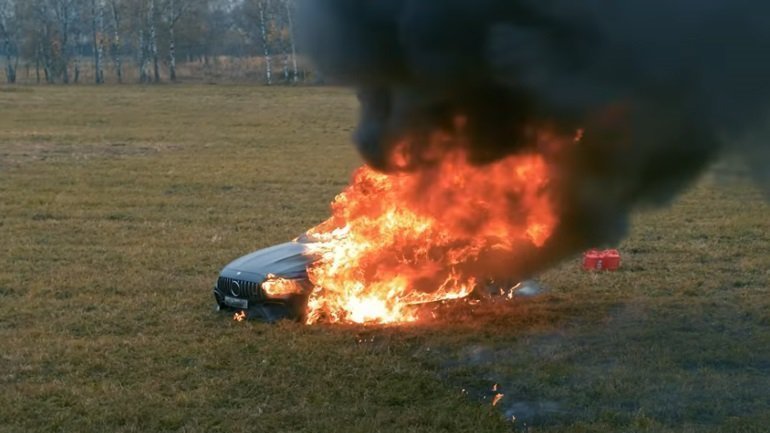 Με ύφος «χιλίων καρδιναλίων» έβγαλε τα μπιτόνια με τη βενζίνη από το πορτμπαγκάζ, περιέλουσε την υπέροχη Mercedes-AMG GT 63 S 4-door Coupe με το εύφλεκτο υγρό και στη συνέχεια της έβαλε φωτιά.