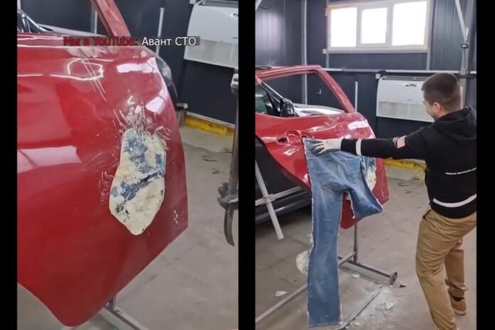 Στο video του carcareru βλέπουμε μια φαινομενικά άθικτη πόρτα, κόκκινου χρώματος. Μόλις ο μάστορας αρχίσει να την σκάβει, όμως, ανακαλύπτει «θησαυρό». Το εσωτερικό της πόρτας, εκτός από αφρό και πλαστικό, έχει και τζιν με παντόφλες! Προφανώς κάποιου είδους πατέντα από συνάδελφο του Ρώσου, ο οποίος είτε δεν διέθετε τα απαραίτητα εξαρτήματα, είτε αποφάσισε να γεμίσει την πόρτα ενδύματα και υποδήματα για χαμηλότερο κόστος ( ή να τιμολογήσει κανονικά την επισκευή και να βάλει τσέπη το κέρδος). Μάλιστα, δεν μιλάμε καν για ρετάλια ή κομμένα κομμάτια. Τόσο το τζιν όσο και οι παντόφλες, μπήκαν στην πόρτα ολόκληρα!