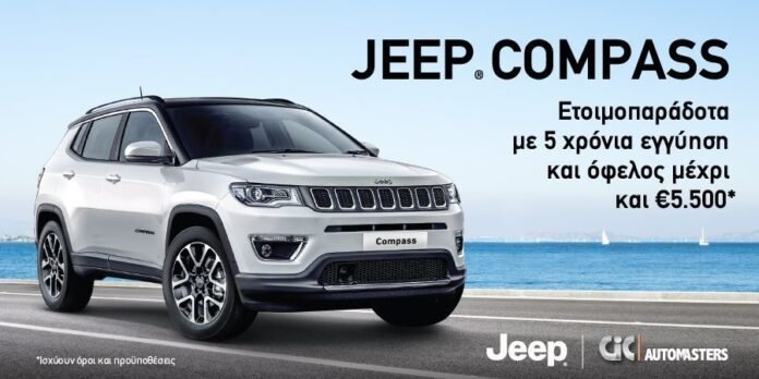 Τη νέα της προωθητική ενέργεια ανακοινώνει η CiC Automasters, μέσω της οποίας δίνει τη δυνατότητα στους Κύπριους οδηγούς να αποκτήσουν ετοιμοπαράδοτο Jeep Compass 4×4 με όφελος μέχρι €5.500 και 5 χρόνια εργοστασιακή εγγύηση. Η προσφορά ισχύει για περιορισμένο αριθμό ετοιμοπαράδοτων αυτοκινήτων και αφορά αυτοκίνητα 2.0 Diesel, με 9-τάχυτο αυτόματο κιβώτιο ταχυτήτων και επιλεγμένους συνδυασμούς εξοπλισμού.