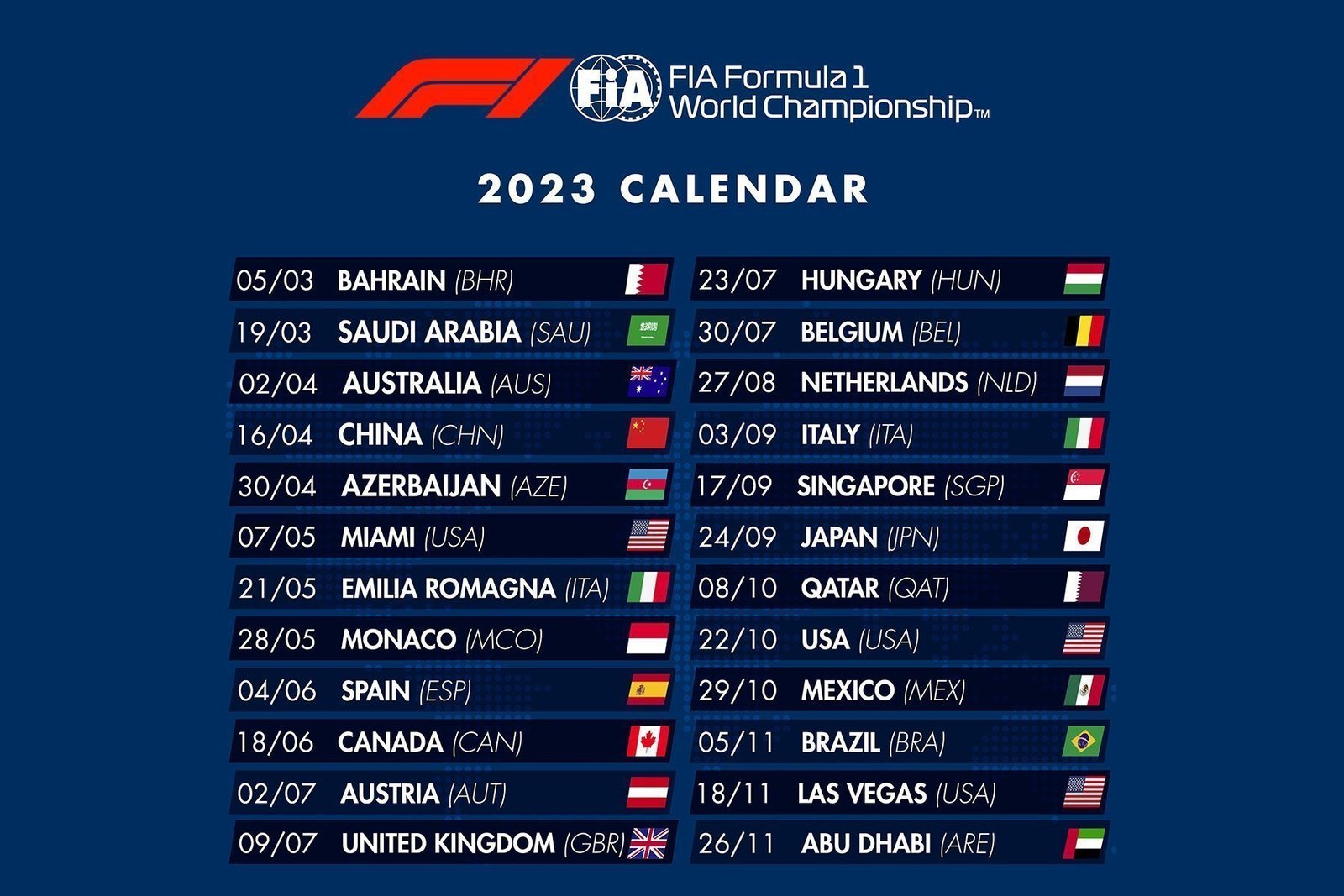 Τον περασμένο Σεπτέμβριο, η Formula 1 αποκάλυψε το ημερολόγιο των αγώνων για τη σεζόν του 2023, με το Παγκόσμιο Συμβούλιο Μηχανοκίνητου Αθλητισμού της FIA να εγκρίνει το πρόγραμμα 24 αγώνων, τους περισσότερους στην ιστορία του θεσμού.
