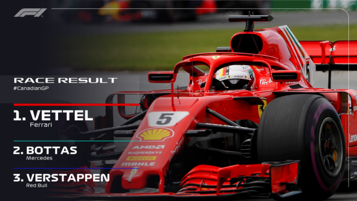 Μία εύκολη νίκη και συγκεκριμένα την 50η της καριέρας του κατέκτησε στο Μόντρεαλ του Καναδά ο Vettel. Ο πιλότος της Ferrari είχε ένα εύκολο απόγευμα και χωρίς να δεχτεί κάποια μεγάλη πίεση επικράτησε των αντιπάλων του. Οι βαθμοί μάλιστα της πρώτης θέσης σε συνδυασμό με την 5η θέση του Hamilton τον έφεραν στην κορυφή του βαθμολογικού πίνακα.