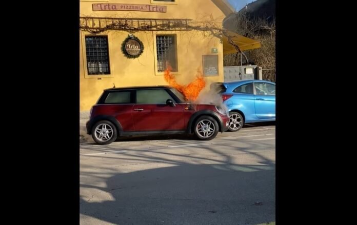 Για κάποιο άγνωστο λόγο ένα σταθμευμένο ΜΙΝΙ πήρε φωτιά και στη συνέχεια άρχισε να κινείται φλεγόμενο (λογικά το βραχυκύκλωμα χτύπησε το Starter) και να χτυπά τα εμπρός από αυτό σταματημένα αυτοκίνητα.