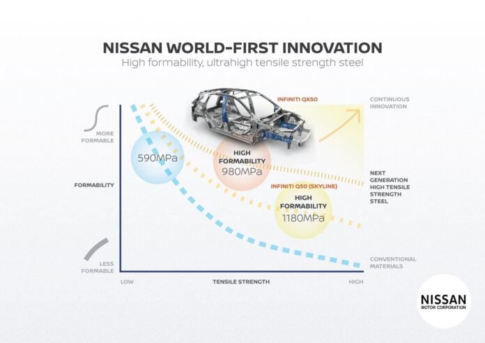 Η Nissan είναι η πρώτη αυτοκινητοβιομηχανία παγκοσμίως που χρησιμοποιεί τον υψηλής αντοχής χάλυβα, με αντοχή εφελκυσμού 980 megapascals, που ανέπτυξε από κοινού με τις Nippon Steel & Sumitomo Metal Corp. Ο συνδυασμός των δυνατοτήτων μορφοποίησης και αντοχής στον χάλυβα, επιτρέπει την παραγωγή σύνθετων σχημάτων που είναι λεπτότερα και ελαφρύτερα (συγκρινόμενα με αυτά που κατασκευάζονται από συμβατικό χάλυβα υψηλής αντοχής σε εφελκυσμό), διατηρώντας ταυτόχρονα την ικανότητά τους να απορροφούν την ενέργεια σε μια πρόσκρουση.