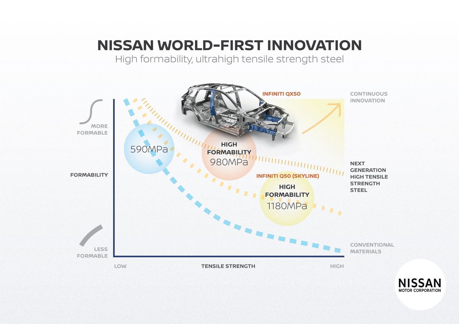Το Infiniti QX50, το πολυτελές μεσαίο SUV που κυκλοφόρησε στις ΗΠΑ τον περασμένο Μάρτιο, είναι το πρώτο όχημα στον κόσμο με εμπρόσθια και οπίσθια πλευρικά μέρη κατασκευασμένα από εξαιρετικά ανθεκτικό χάλυβα αντοχής 980 megapascal, μαζί με άλλα μέρη του πλαισίου. Η Nissan σχεδιάζει να επεκτείνει τη χρήση του συγκεκριμένου υλικού και σε άλλα μοντέλα, καθώς έτσι βελτιώνει την απόδοση του καυσίμου και της οδήγησης, λόγω του μειωμένου βάρους του χάλυβα.