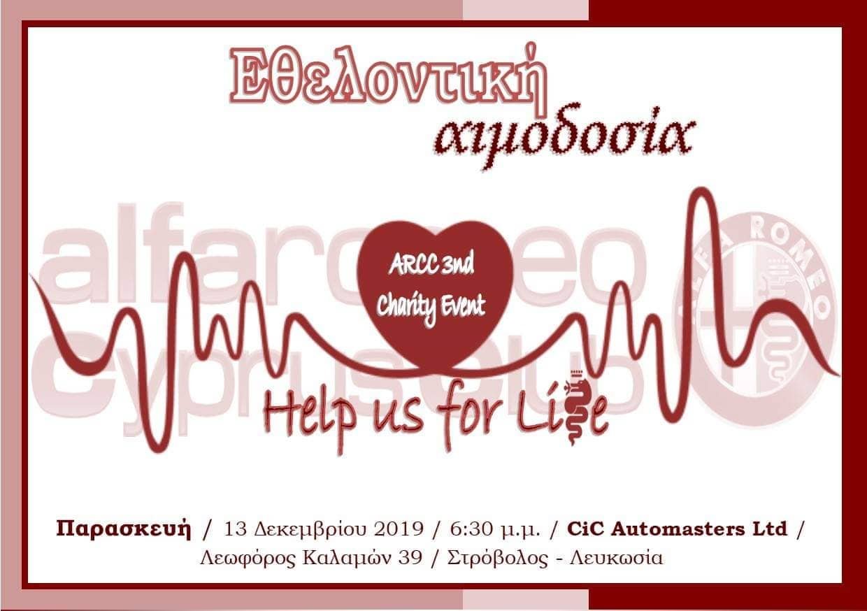 Η CiC Automasters Ltd σε συνεργασία με το Alfa Romeo Cyprus Club, διοργανώνουν Ημέρα Αιμοδοσίας την Παρασκευή 13 Δεκεμβρίου 2019. Η αιμοδοσία θα πραγματοποιηθεί στον εκθεσιακό χώρο της CiC Automasters Ltd στη Λευκωσία (Λεωφόρος Καλαμών) από τις 18:30 μέχρι τις 20:30, και καλούνται να προσέλθουν όσοι εθελοντές και τακτικοί αιμοδότες το επιθυμούν.