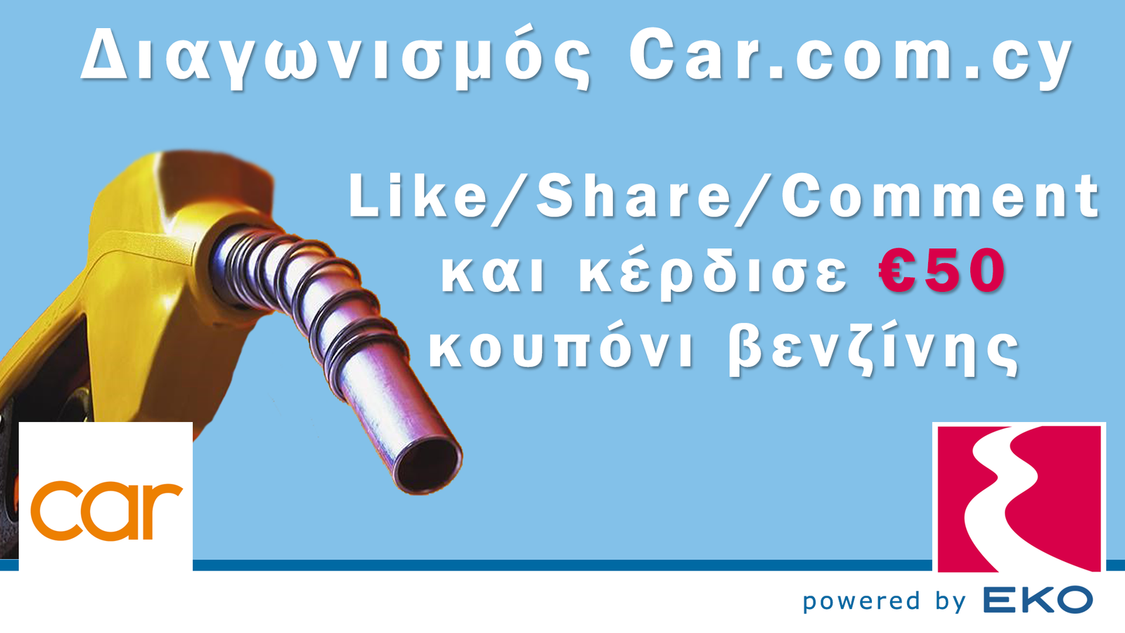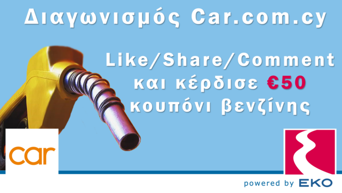 Παρασκευή σήμερα (26 Μαίου) και το Car.com.cy θέλει να σας χορηγήσει τα καύσιμα μιας όλοκληρης εβδομάδας. Σε συνεργασία λοιπόν με την EKO σας προσφέρουμε ένα δωροκουπόνι για καύσιμα αξίας 50 ευρώ. Το μόνο που έχετε να κάνετε είναι να ακολουθήσετε τους όρους συμμετοχής που αναγράφονται πιο κάτω. Ο διαγωνισμός θα διαρκέσει μέχρι την Τετάρτη 31 Μαίου τα μεσάνυχτα και ο νικητής θα ανακοινωθεί την επόμενη μέρα έτσι ώστε να ξεκινήσει καλά το καλοκαίρι του… :p Ο Διαγωνισμός γίνεται στο facebook γι’ αυτο πατήστε την πιο κάτω φωτογραφία για να μεταβείτε στο ανάλογο πόστ. Καλή τύχη!