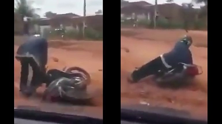 Ευτυχώς που για τόσο σοβαρές περιπτώσεις προνοεί η βαρύτητα, αποτρέποντας τα χειρότερα. Μη φοβάστε όμως, δεν χτύπησε κανείς, ίσως μόνο το άμοιρο το μηχανάκι..