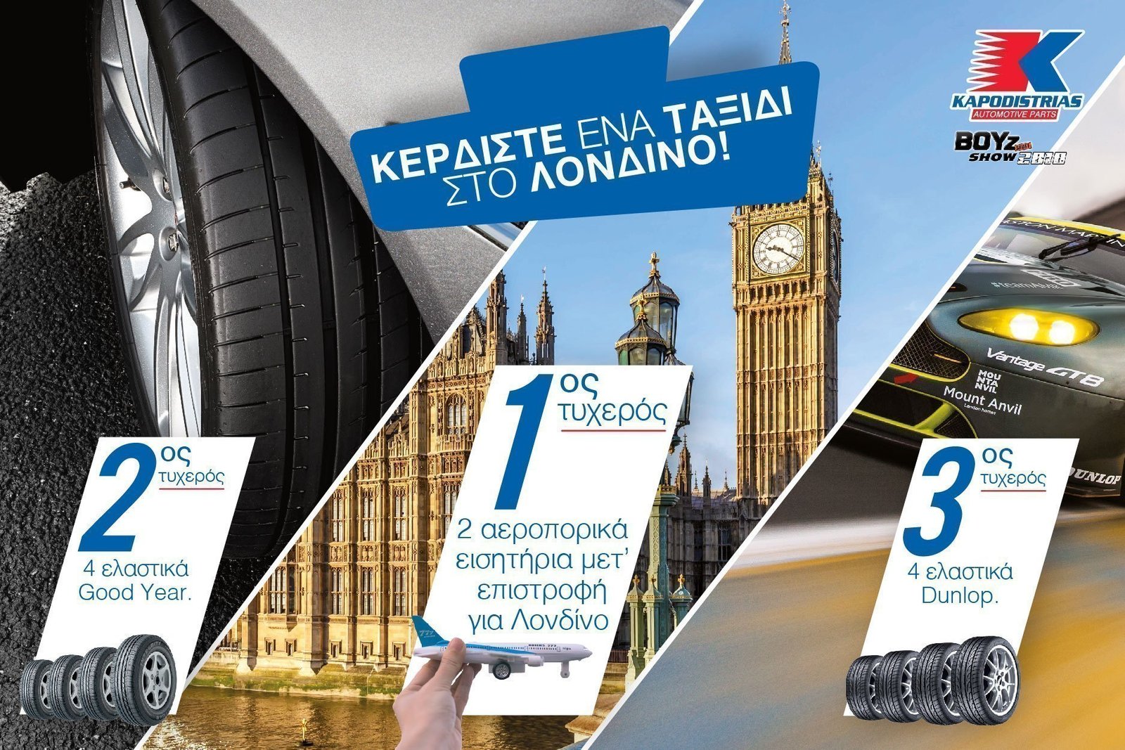 Ενόψει της συμπλήρωσης ενός χρόνου από την ένταξη στο δίκτυο της εταιρείας Καποδίστριας τον προσεχή Δεκέμβριο και με την ευκαιρία της συμμετοχής στο Boyz Stuff Show 2018, η Goodyear / Dunlop κληρώνει δύο αεροπορικά εισιτήρια για Λονδίνο και δύο σετ ελαστικών.