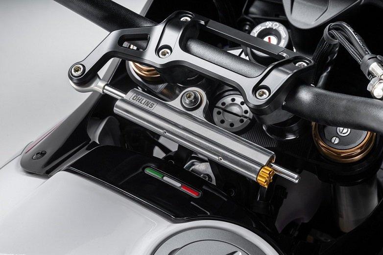 - Ρυθμιζόμενο αμορτισέρ τιμονιού Öhlins στερεωμένο στο τιμόνι *