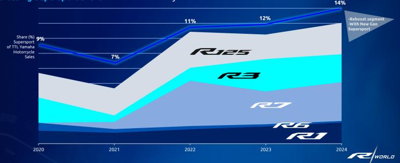 Μέσα στην οικογένεια της Yamaha η σειρά “R” από το ελάχιστο του 7% των πωλήσεων της εταιρίας το 2021, έφτασε στο διπλασιασμό του 14% το 2024, χάρις κυρίως στην R7, το μοντέλο που συνεχίζοντας την επιτυχημένη συνταγή της R3, καθιερώνει τη νέα εποχή των Supersport, που έρχεται να ολοκληρωθεί με τη νέα R9.