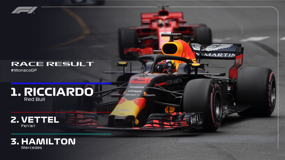 Την πρώτη θέση του γκραν πρι στο Μονακό κατέκτησε ο Daniel Ricciardo σε έναν αγώνα που διεξήχθη χωρίς πολλά απρόοπτα και αλλαγές στην κατάταξη. Ο Αυστραλός πιλότος της Red Bull ξεκίνησε από την πρώτη θέση και δεν απειλήθηκε από κανέναν συνανθλητή του μέχρι το πέσιμο της καρό σημαίας. Μάλιστα, παρά τα μικρά προβλήματα που έκαναν την εμφάνισή τους με τον κινητήρα του μονοθεσίου του δεν στάθηκαν ικανά να του στερήσουν τη νίκη!