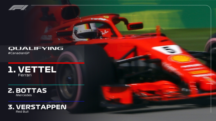 Πριν από λίγο ολοκληρώθηκαν οι κατατακτήριες δοκιμές στο GP του Καναδά, στις οποίες ο Vettel με Ferrari κατέκτησε την Pole Position καθώς σημείωσε τον καλύτερο χρόνο. Ο Γερμανός θα εκκινήσει από την πρώτη θέση της εκκίνησης έχοντας δίπλα του τον Bottas με Mercedes.