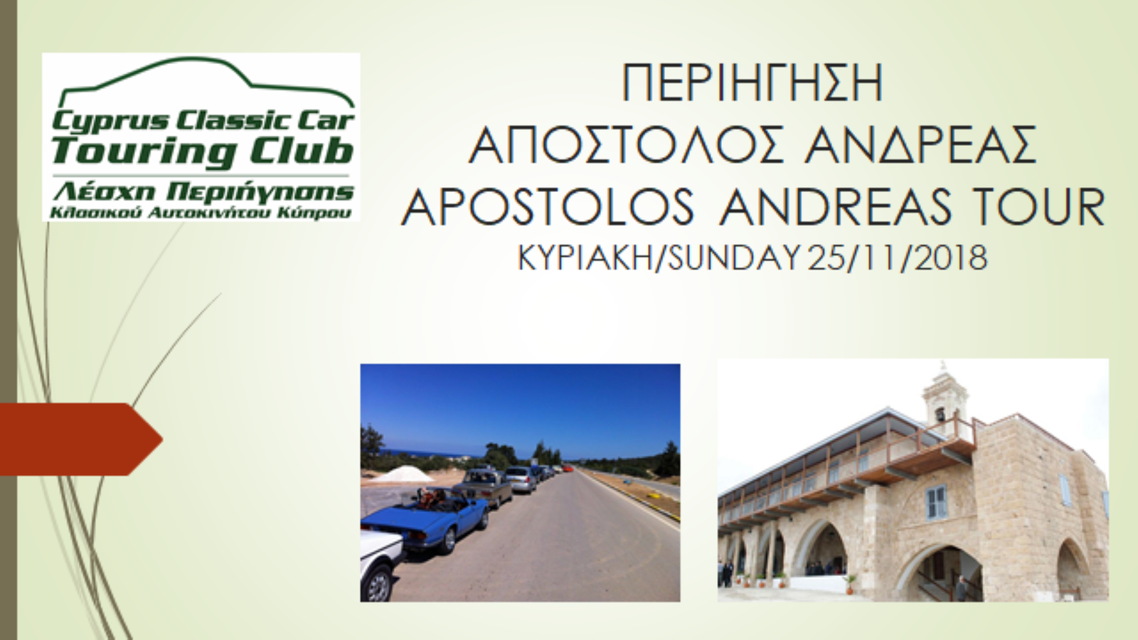 Για δεύτερη κατά συνέχεια χρονιά, το Cyprus Classic Car Touring Club διοργανώνει την Περιήγηση Κλασικών Αυτοκινήτων «ΑΠΟΣΤΟΛΟΣ ΑΝΔΡΕΑΣ» την Κυριακή 25 Νοεμβρίου 2018. Η εκδήλωση γίνεται σε συνεργασία με τον Κοινοτάρχη Ριζοκαρπάσου και θα δώσει την ευκαιρία στους συμμετέχοντες να προσκυνήσουν στο μοναστήρι με την ευκαιρία της ετήσιας γιορτής του Αποστόλου.