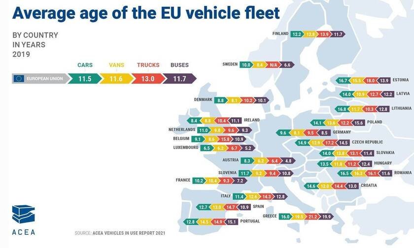 Με βάση τα στοιχεία της ACEA λοιπόν, στην Ευρώπη συνολικά ο μέσος όρος ηλικίας των ΙΧ είναι τα 11,5 χρόνια, των ελαφρών επαγγελματικών και βαν τα 11,6, των λεωφορείων τα 11,7 και των φορτηγών τα 13,0.